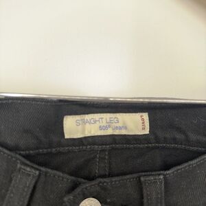 Elevate your style with these black denim Levi's 505 straight leg jeans. Crafted from a comfortable cotton blend fabric with a medium wash finish, these jeans feature a zip closure and button accents for a classic look. The 5-pocket design provides ample storage space, while the regular fit and mid-rise ensure a flattering silhouette.