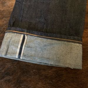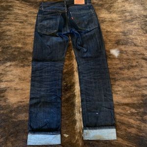 Straight leg with zipper fly; style no. 505-0217. High quality, rigid, selvedge denim. Never washed. See photos for measurements and a few marks on back of right leg and interior cuff.