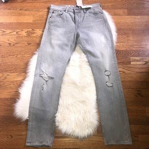 Levi’s 505c Slim straight gray jeans. Gray Stretch denim fabric. Distressing on legs. New with tags. High rise with zipper fly. Size 29 x 30. Please refer to photos for approximate measurements.