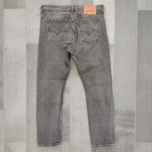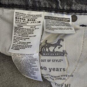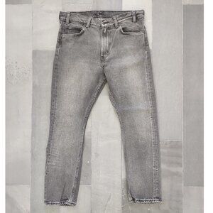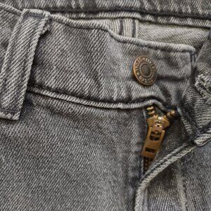 Grey with some natural fading. Orange tab. 98% cotton / 2% elastane. Thick, rigid denim. Mid rise.