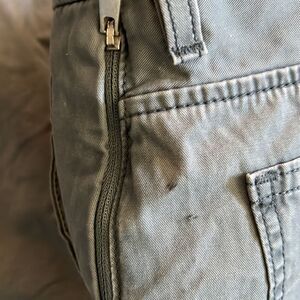 Only 2 tiny tear very tiny next to the zipper pocket rest good condition style is like faxed nice trouser soft pants