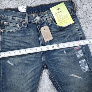 Men's Levi's 510 Skinny Flex Eco Performance Stretch medium to dark wash blue denim jeans with slight yellow tint. Ripped, distressed, or destroyed. Style number 05510-1273. New with tags. Men's size 29 x 30, real measurements shown in photos with jeans laid flat: