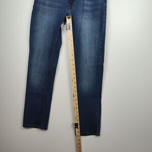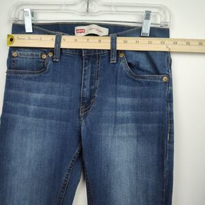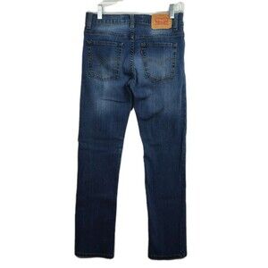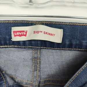 The product is a pair of Levi's 510 skinny jeans in a boy's youth size 14 regular fit, featuring a dark wash denim fabric in a solid blue color. They have a zip and button closure, with a 27-inch waist and 27-inch inseam. The Levi's 510 model offers a skinny fit, making them a fashionable choice.