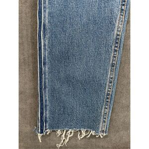 Levis 510 Skinny jeans in a light wash denim with a unique raw-edge exposed side seam and frayed hems for a modern deconstructed look. Features a skinny fit with a low rise, classic five-pocket styling, and faded vintage-inspired finish. Style leans heavily into Y2K, streetwear, or DIY fashion. In good condition with fraying along side seams and hems—see photos. Please see photos for measurements.