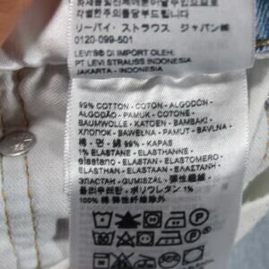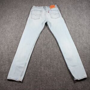 Classic Levi’s 510 skinny fit in a light blue wash with comfortable stretch. Good pre-owned condition with normal wear; tiny faint spot on front leg near the outseam—see close-up photo. Color may vary slightly from photos due to lighting and monitor settings.