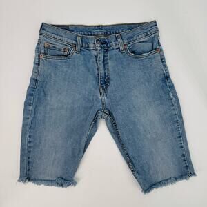 Levi's 511 light wash denim jean shorts for women, size 31. Designed with a mid-rise fit, these shorts feature a trendy raw hem for a modern look. Crafted from stretch denim, they provide comfort and flexibility for all-day wear. Ideal for casual outings, these shorts pair well with a variety of tops for effortless summer style.