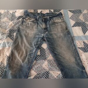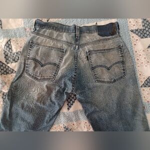 Levi's 511 slim fit straight denim stretch blue jeans. pre-owned. They have a worn look with fading & vintage grunge vibes. Levi's enbossed zipper fly and levis strauss signature button with 3440 on back of button. black back waist label torn off. fraying and distressing on & near the front pockets. laundered with simple green. see pictures. they are part of the description. measurements are approximate. Features the rare black "R" back pocket tab.