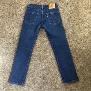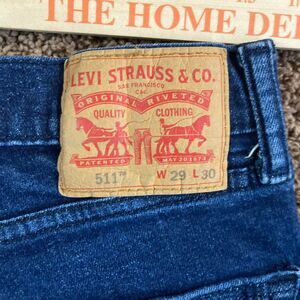 The product is a pair of Levi's 511 Slim Fit Jeans in size 29 x 30, with a dark wash blue denim color. These jeans feature a solid pattern, zip and button closure, and are made from a cotton blend denim fabric. The slim fit style and stretch feature make them comfortable and stylish for all seasons. The garment care is machine washable, and they are adorned with the Levi's logo as accents. Perfect for men looking for a quality pair of slim fit jeans with a classic denim style.