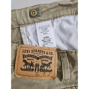 The product is a pair of teens size 14R (27x27) Levi's 511 jeans in a tan color made from a cotton/elastane blend. These slim-fit, skinny style jeans feature a zip and button closure, pockets, stretch for comfort, and are suitable for casual occasions such as travel, walking, school, and hiking. The beige color and solid pattern make them versatile for various seasons, including winter, fall, and spring. The garment care is machine washable, and they are made by the brand Levi's in China. Perfect for a boy looking for stylish and comfortable jeans.