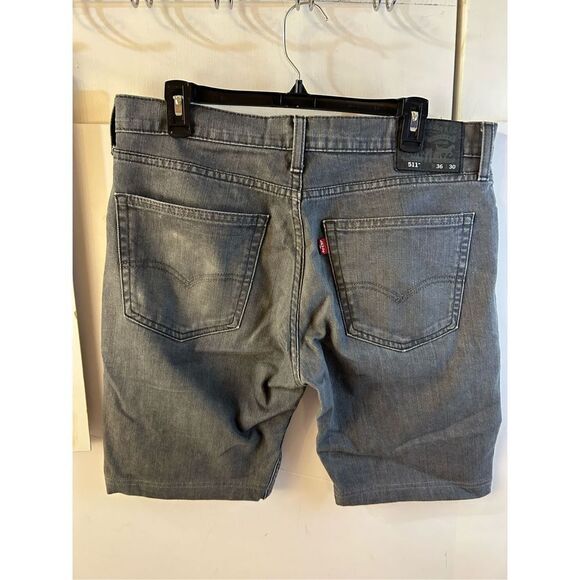 Levi’s 511 dark denim shorts 36w. jeans modified to shorts. measures 17.5" across the waist, 8" inseam. no material label but cotton blend. red tag. faded black color. good used condition.