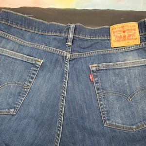 Levis 511. SIze 36 x 34. Worn in to the perfect level of softness, deep indigo blue. Hole on back left leg.