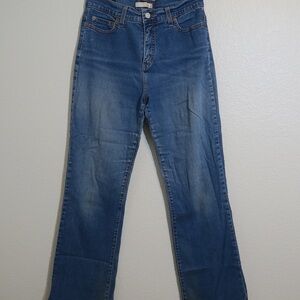 Denim blue bootcut high waisted Levi's jeans, high rise, cotton blend. Good preloved condition, some signs of wear - folding of the jeans in the waistband and some fringing in the bottom as seen on pics