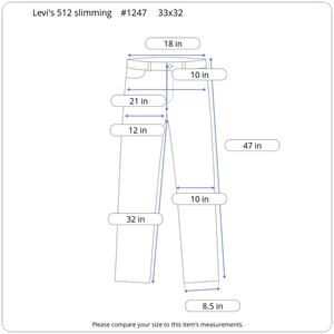 Levi’s 512 Perfectly Slimming Straight Leg Jeans for Women, size 33x32 (tagged 16M). Mid-rise with a slim fit through the hips and thighs, finished with a straight leg cut. Stretch denim offers shaping and comfort for everyday wear. Classic medium wash with contrast stitching and subtle fade detail.