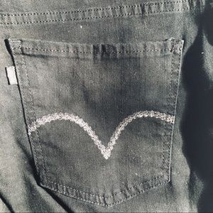 Levi’s 512 Perfectly Slimming boot cut jet black jeans. No fading. Size 14. Measurements: Waist 17”, rise 12”, inseam 31”.