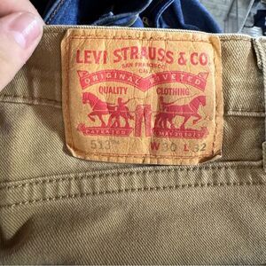Gently worn men's size 30x32 Levi's 513 Slim straight tan jeans. Please review all photos for any signs of wear-pictured as is. Disclaimer: Any items with any wear/staining has not been treated, and unsure of ability to remove/treat condition. Comes from a smoke free home, bundle with other items to save & minimize shipping cost.