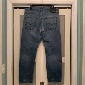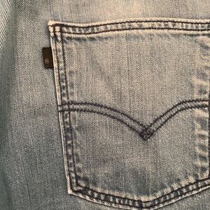 Levi’s 513. Size 33x30. Slight fraying on top of right pocket. Right knee is thin and starting to show signs of wear. All imperfections are pictured. Very cool faded blue pair of jeans. Very comfortable.