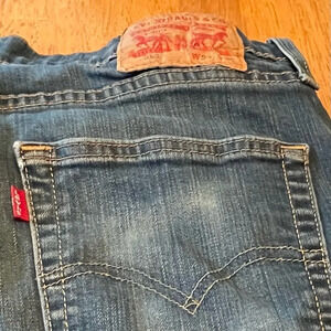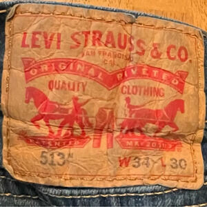 Levi’s 513 jeans, size 34/30. They have fraying at the hems and signs of wear (see all the pictures). There are no holes, rips or stains.