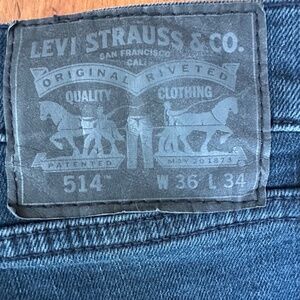 Gently worn Men's Levi's 514 jeans. Size 36 x 34 5 pockets, zipper and button work fine. Black Label. Some creases to the fabric. In great condition!