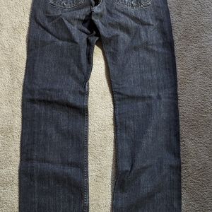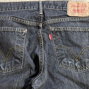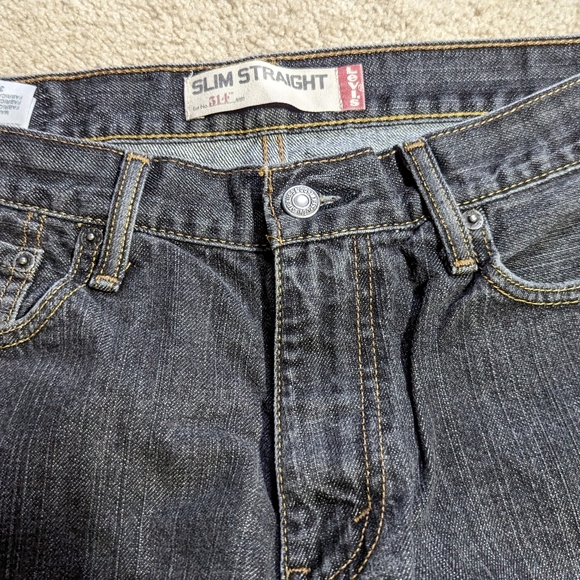 Levi's 514 straight slim, black denim jeans. small discoloration on front of one leg. No idea what it is or how it happened. The jeans are a size 33waist, 32inseam. These jeans have been worn and are broken in.