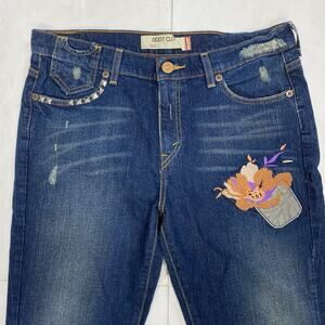 Condition: Pre-owned jeans in good overall condition. Features embroidery on front leg and studded detailing on coin pocket. Please note: some studs are missing from the right coin pocket (see photos). Light wear, fading, and distressing present, consistent with normal use. All details shown in photos.