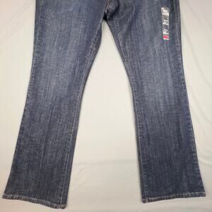 Style: Dark wash stretch denim with mid-rise and classic bootcut leg. Timeless stitching, five-pocket style, brand new with tags.