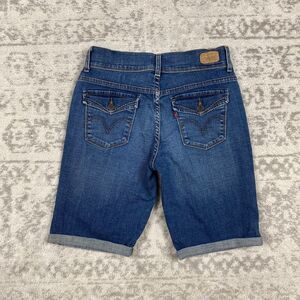The product is a pair of Levi's 515 denim shorts for women in a casual Bermuda style. These cuffed shorts in size 4 feature a solid blue color with a stretch denim fabric made of spandex and cotton. They have a zip closure, 5-pocket design, and a flat front. Ideal for occasions like travel, parties, or casual outings, these mid-rise shorts offer a comfortable regular fit perfect for the warmer seasons of summer, fall, and spring. Made by Levi's, the renowned brand known for quality denim apparel.