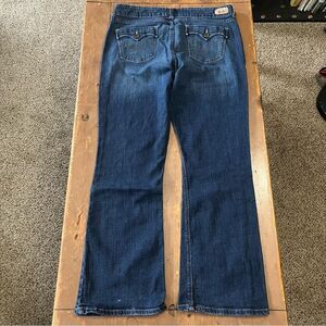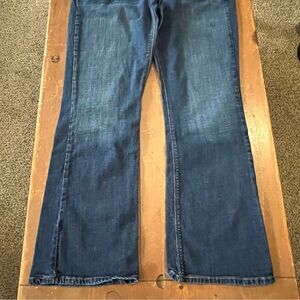 These jeans are a mid-rise style with a bootcut leg and a medium wash. They have a classic five-pocket design and a zip fly with a button closure.