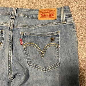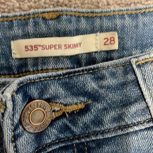 Levi’s 535 Super Skinny Jeans with Star Studs and Embroidered Hearts in size 28. Excellent like new condition, they have been washed but never worn. Second photo is stock photo. Traditional 5 pocket style with zipper and button front closure, raw hem. Please see photos for approximate measurements and details. Photos are part of the description, as everyone’s level of condition may vary. From smoke free and pet free home.