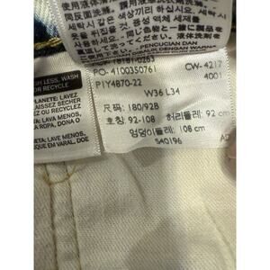 The product is a pair of Levi's 541 Mens Jeans in size 36x34, featuring a white and blue acid wash with a bleach denim style. These straight-leg jeans have a zip and button closure, mid-rise fit, and a 5-pocket design with a 34-inch inseam. The jeans also have a stretch denim fabric for added comfort and flexibility. With a retro and hip hop theme, these Levi's 541 jeans are a stylish and versatile addition to any wardrobe, suitable for all seasons. Made with a cotton blend fabric, these jeans are machine washable for easy care. The jeans are New Without Tags.