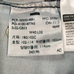 The product is a pair of Levi's 550 straight leg red label jeans in size 40x32. These jeans feature a solid blue color, denim fabric made of cotton, and a 5-pocket design. The closure is a zip, and they are machine washable. good condition nonsmoker and pet free home. no holes nor stains
