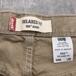 Vintage Levis 550 Jeans in Light Brown/Tan, for men. Size 38Wx32L. Made from quality cotton, designed in a relaxed fit with a straight style. Features the iconic black batwing logo.
