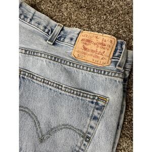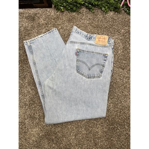 The product is a pair of Levi's 550 Men's Jeans in size 46x32,. These relaxed fit denim pants feature a solid blue color with a light wash, made from cotton denim fabric. The zipper fly closure and straight leg style offer both comfort and style, while the easy care and pockets features add practicality to the design. This product, part of the Levi's 550 line, is a reliable and stylish choice for men looking for quality denim pants.