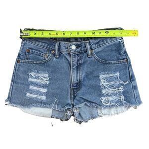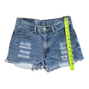 Levi’s 550 Printed Back Pockets Distressed Jean Denim Raw Fringe Shorts Size 29