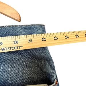 These jeans were purchased to be used as wardrobe for a tv production. The studio made some marks on the inner tag and one of the belt loops came undone at one side and left a resulting small hole, otherwise these are in good condition.