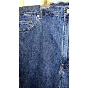 The Levi's 550 Relaxed Fit Straight 48x30 Zip Blue Men's Jeans are a pair of stylish and comfortable denim pants designed for men. Made from a cotton blend fabric with added stretch, these jeans feature a classic 5-pocket design and a relaxed fit for all-day comfort. The mid-rise waist and straight leg cut make them versatile for wearing in any season. The dark wash and solid blue color add a timeless touch to the Levi's 550 series from the Levi's 500 collection. Perfect for casual or dressed-up occasions, these new, never-been-worn jeans are a wardrobe staple for any man looking for quality and style.