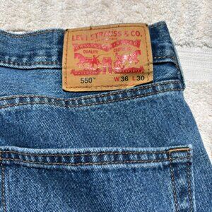 Great condition men's Levi's 550 relaxed fit, no stretch jeans (36x30). Hem displays miniscule wearing without fraying. The pants are otherwise pristine. Let me know if you want to see close-ups of any part of the jeans.