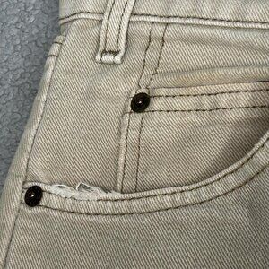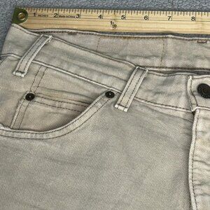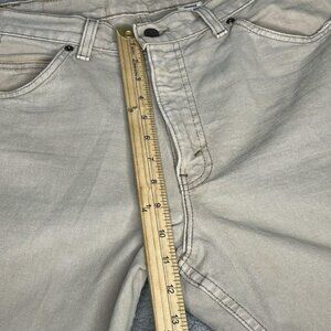 Condition: Previously worn with general wash wear and fading. Fraying at the edge of the front pocket openings and fraying at the leg hems, as shown. Fabric otherwise intact and zipper and button function properly. Tag size is 34x32. Length has been hemmed to 29.5 inches.