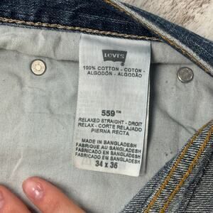 Levis 559 Faded Dark Wash Blue Mens 38x36 Straight Leg Relaxed Jeans Red Tab Washed Out Jeans Pre-owned condition. Please note that the item has stains on fading, & stains are present on the front leg area, zipper fly belt loop classic american premium denim casual workwear classic streetwear.