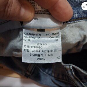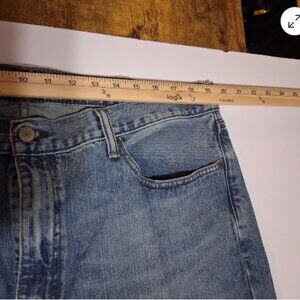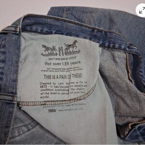 Pre-owned and well-loved pair of Levi's 559 Relaxed Straight Fit jeans in W40 L30. Made of classic blue denim, these jeans feature the signature 5-rivet design and were manufactured during the 11th week of 2013. Signs of wear include fraying at the leg openings and belt loops, but overall solid with character. wash to wear