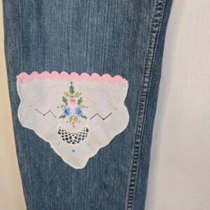 Unique women's jeans, creatively customized with vintage embroidered doilies. These Levi's 559 denim pants feature charming, lady and flowers each with delicate lace and embroidered details, adding a touch of vintage flair and one-of-a-kind artistry. The denim provides a classic backdrop for the whimsical embellishments, making these a statement piece.