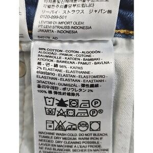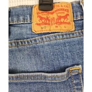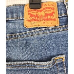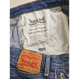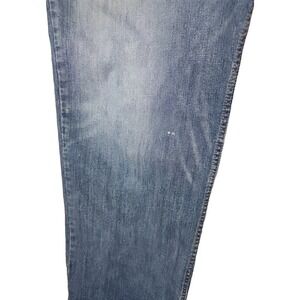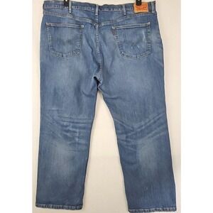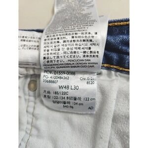 This pair of Levi's 569 jeans in size 48 waist and 30 inseam features a relaxed fit with a straight leg style. The blue denim fabric is medium washed and made of cotton. The jeans have a zip closure with a button and belt loops. The accents include an embroidered logo, a coin pocket, and a Levi's product line label.