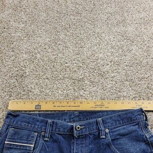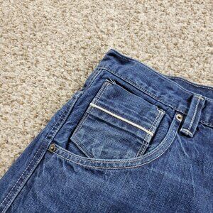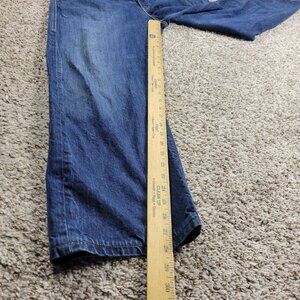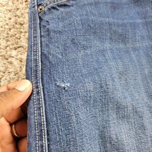Levi's 569 Jeans Mens Blue Loose Fit Straight Dark Wash. Has one snag at front and one at back. Has alteration at bottom to 28 inseam. Small amount of browning by front right pocket