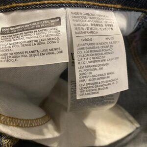The product is a pair of Levi's 569 Loose Straight Dark Wash Blue Denim Baggy Fit Jeans in men's size 44x30 meas(46x28). These jeans feature a classic 5-pocket design with a zip and button closure. Made from cotton denim, they have a relaxed fit and come in a solid dark wash color. The product includes the iconic Levi's logo accents and is part of the Levi's 500 Series. Ideal for the winter, fall, and spring seasons, these jeans are machine washable and designed for regular size men.