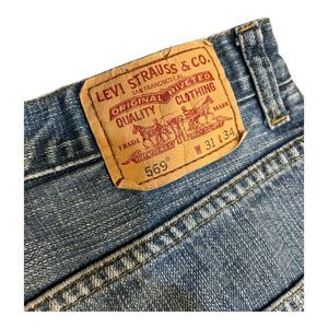 Levis 569 Loose Straight Mens Denim Shorts Size 34 (Actual 31) feature a relaxed fit with a worn-in distressed wash and classic five-pocket styling. Originally a pair of jeans, these were custom cut into shorts, giving them a unique vintage look and character. Made from 100% cotton denim, they offer classic comfort and durability.