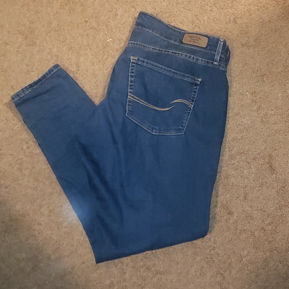 jeans with hole at the left knee (this is the way they are and were bought) a little distressed st the pockets. not stretchy but very comfortable fit