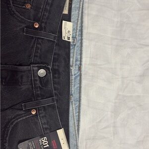 Stylish Levi's black jeans paired with a light blue denim skirt. Perfect for casual outings. Levi’s skirt and Levi’s shorts. Both items are size 30 and both are the 501 non-stretch denim. Items will fit the same person. Shorts are new with tags. Skirt was only used once.