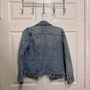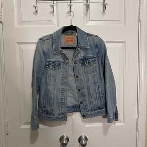 This Levi's Denim Jean Jacket is a versatile wardrobe staple. Made from durable light-wash denim, it features a classic button-front closure, two chest pockets with button flaps, and two side pockets. Perfect for layering in any season, offering timeless style and comfort. Excellent pre-owned condition.