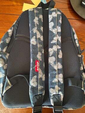 New with tags Levi's Denim Butterfly Backpack in a dark wash blue. This stylish and functional bag features an all-over white butterfly print on durable denim fabric.