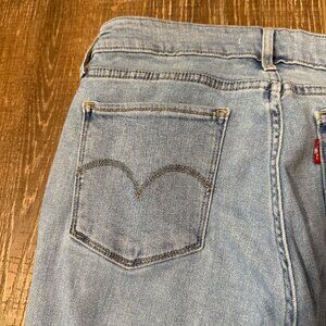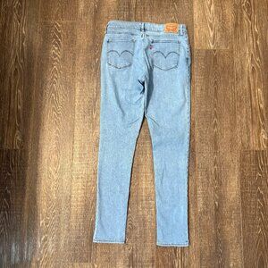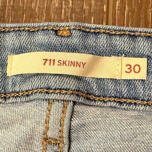 Levi’s 711 Skinny Jeans. (1) Light blue. Size 30. Inseam 30”. 9” rise. 92% cotton, 6% polyester, 2% elastane. 3 front pockets and 2 back pockets. Zip and button closure. In great used condition. Please see photos.