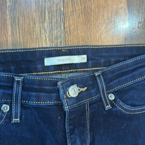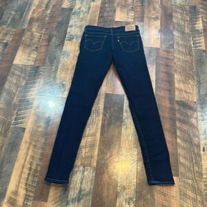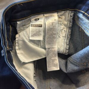Very dark wash skinny jeans. These measure 14 inches across the waist laying flat and have a rise of 8 inches. The inseam measures 31 inches.